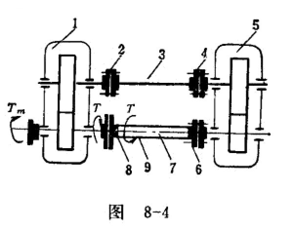 闭式试验台,是由两台中心距和传动比相同的齿轮箱(见图8-4中的1和5),用传动轴3,弹性轴7和联轴节2、4、6、8相连结,形成一封闭系统。施加载荷时,松开加载联轴节8的联接螺钉,施加外力矩,使弹性轴产生扭转变形,然后锁紧联轴节8上的联接螺钉,也就是锁住了弹性轴7的扭转变形。在这·个封闭系统内,由弹性轴变形而产生的封闭载荷,它只能使啮合轮齿之间产生一定的啮合力而并不带动它们运转。换句话说,加载机构只是把力施加于系统之内,但并未对系统做功。当试验台运转时,电动机输出的功率比开式试验台小得多,仅需用来克服试验台整个系统的内摩擦损耗,这些损耗包括啮合损耗、搅油损耗、轴承损耗、联轴节损耗和弹性轴上的损耗等。不过,后两项损耗极为微小,可略而不计。闭式试验台驱动电机的功率,约为封闭系统传递功率的4~10%,其数值与啮合付的效率、润滑油粘度和加载器的转动惯量等有关,因此,闭式试验台所消耗的功率比开式试验台节约得多。下面分析一下闭式试验台系统中功率流动的情况。