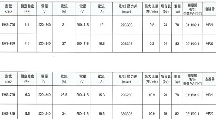 EHS729/829 离心式高压鼓风机特点:压力高 风量大 无油气 免保养 寿命长 低震动,高风压 体积小,重量轻 低噪音,新设计规格:三相交流电 50HZ/60HZ 最大风量:5.2立方米/6.2立方米功率:2200W/2600W 电压:200-240V/220-240V 346-415V/380-480V 电流:6.7A/10.6A 5.6A/6.1A