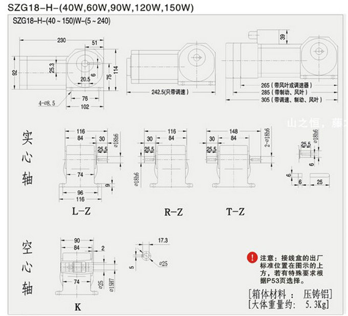 直交轴小型减速机SZG-H(实心右出轴)山藤SEND直交轴减速机功率:25~120W减速比:1/5~1/240轴布置:直交轴特点:1.高效率与低噪音 山藤SEND减速机采用准双曲面齿轮设计,在性能上兼顾有斜齿轮的低噪音性和伞齿轮的高效率特点,是一款不可多得的高效且低噪的减速机。 与蜗轮蜗杆减速机相比,双曲面齿轮的滑动摩擦较小,因此其传动效率比蜗轮蜗杆高;最高可达98%的传动效率。另一方面,螺旋伞齿轮的齿轮啮合一般在2齿左右,而山藤SEND准双曲面齿轮拥有越2.5齿的啮合,因此其运转时噪音比伞齿轮更低。2.与蜗轮蜗杆齿轮箱相比,山藤SEND的使用寿命更长 山藤SEND的齿...